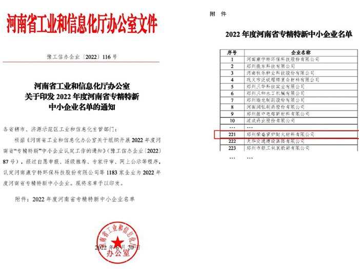 近日,河南省工業和信息化廳公布了《河南省工業和信息化廳辦公室關于印發2022年度河南省“專精特新”中小企業名單的通知》。經省工業和信息化廳組織專家評審,鄭州榮盛窯爐耐火材料有限公司被認定為2022年度河南省“專精特新”企業。這是繼榮獲“國家高新技術企業”、“河南省科技型中小企業”后,榮盛耐材在科技創新領域獲得的又一殊榮。