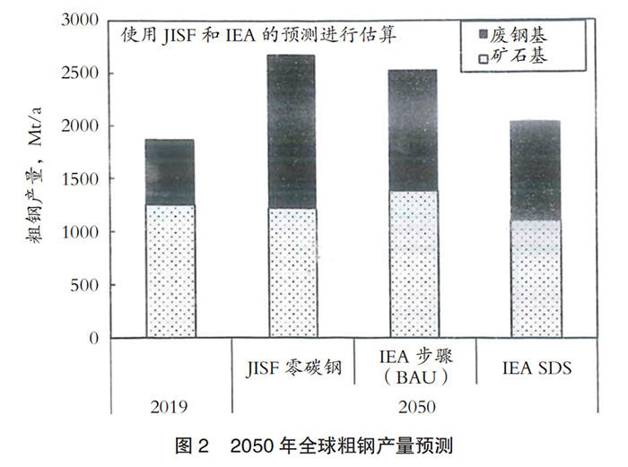 圖3是在各機構預測的基礎上,預測2050年粗鋼產量。未來,隨著經濟的發展,預計全球粗鋼產量將繼續增加。其中,隨著廢鋼產量的增加,雖然來自廢鋼的粗鋼產量也會增加,但為了彌補粗鋼產量的整體增加,來自鐵礦石的粗鋼產量將保持現狀水平。因此,除了盡可能地利用廢鋼,如何減少來自鐵礦石的鋼鐵生產中的CO2排放也是一個主要問題。