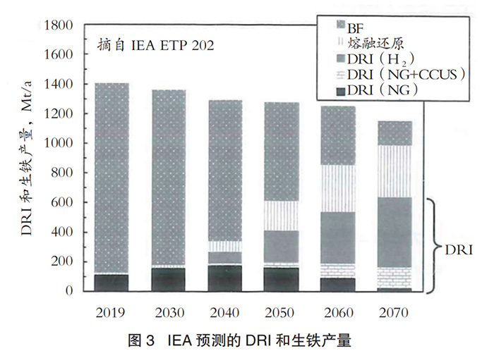 圖4顯示了IEA對不同生產方式的還原鐵和生鐵產量的預測。假設鋼鐵行業根據上述IEASDS,降低CO2排放量。預計2050年高爐生鐵產量將逐步下降,而還原鐵產量將從2019年的1億噸增加到2050年的4億噸。這表明,CO2可以通過直接還原天然氣來立即減排,氫氣和CCS也可以達到減排的目的。