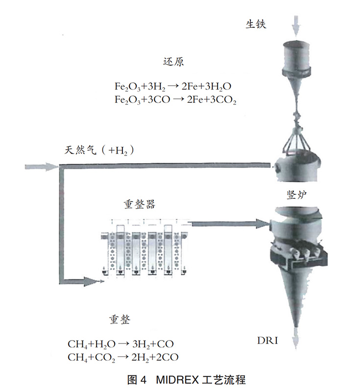 MIDREX法作為直接還原工藝的代表,在圖5中展示了工藝流程。MIDREX法的主要組成部分有兩個,一個是將鐵礦石原料(球團或塊礦)還原成還原鐵的豎爐,另一個是制造豎爐還原所需的還原氣體的改良爐(重整爐)。