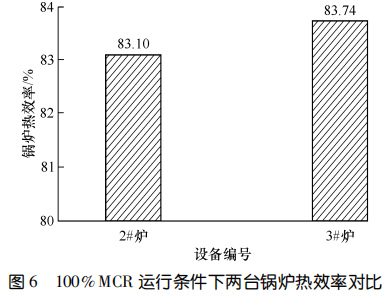 兩臺設備運行 11 個月后進行了能效測試。圖5對比了 90%鍋爐大的連續蒸發量(簡稱 MCR)和100%MCR 條件下鍋爐一通道的出口煙溫。圖6示出了100%MCR運行條件下兩臺鍋爐熱效率的對比。結果顯示:在 90%MCR 運行條件下,3#爐一通道出口煙溫比2#爐低 135.9 ℃,在100%MCR 運行條件下,3#爐一通道出口煙溫比 2#爐低 149.7 ℃,3#爐的熱效率比 2#爐高 0.64%。相較而言,使用膜式壁爐襯的3#爐在負荷相當的情況下,余熱鍋爐熱效率更高。